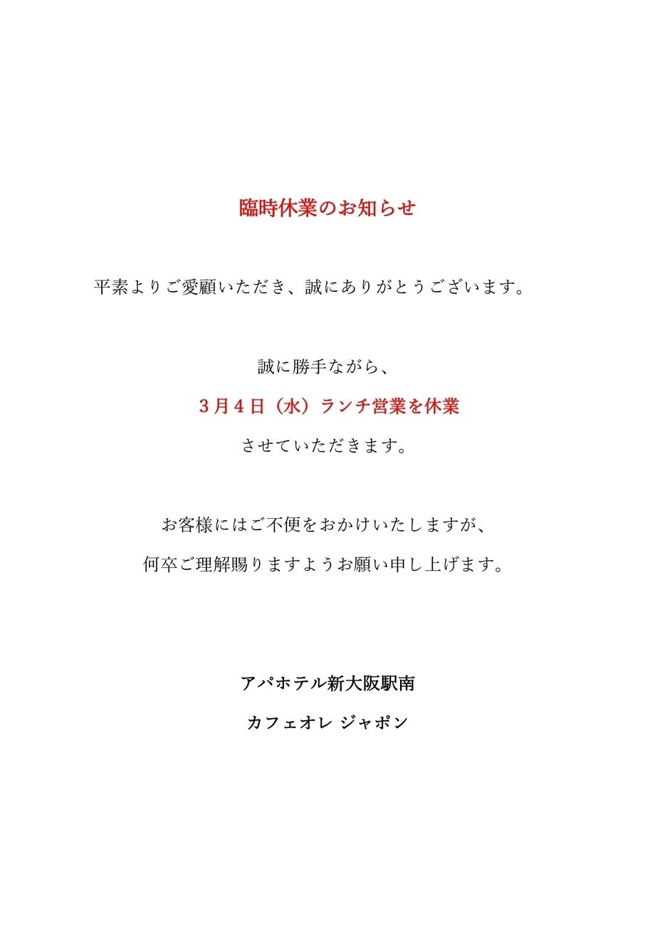 ランチ臨時休業のおしらせ 2026.3.4 (水)